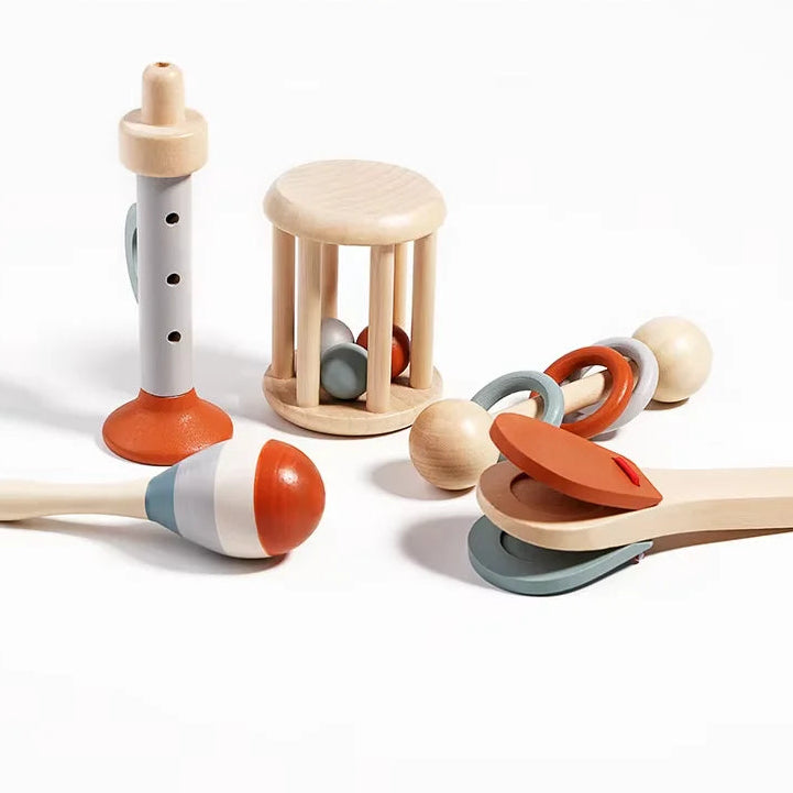 Introduce your little one to the joy of sound, rhythm, and movement with this beautifully crafted Wooden Musical Discovery Toy Set. Designed especially for tiny hands and curious minds, this charming 5-piece set turns everyday playtime into a safe, soothing, and educational musical adventure for your munchkins.